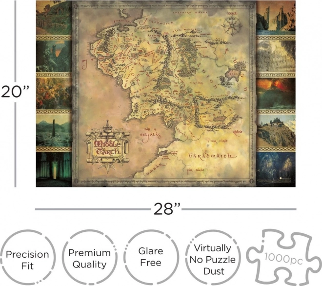 Stijlvolle puzzel met het thema van de kaart van Midden-aarde die elke fan van de In de ban van de ring-saga zal bekoren. Met 1000 nauwkeurig gesneden stukjes biedt hij een prettige uitdaging en tegelijk ontspanning tijdens het puzzelen. De voltooide afbeelding komt prachtig tot zijn recht als decoratie in kantoor, woonkamer of gamehoek.