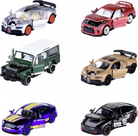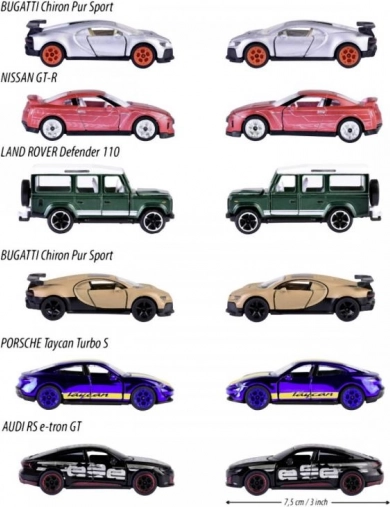 - Mix van 6 modellen: AUDI RS e-tron GT (zwart), BUGATTI Chiron Pur Sport (bruin/zilver), LAND ROVER Defender 110 (groen), NISSAN GT-R (rood), PORSCHE Taycan Turbo S (blauw)