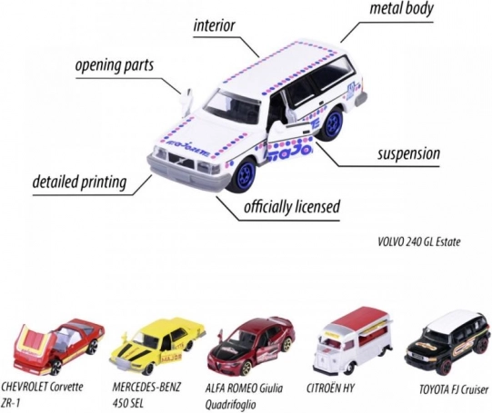 Elk autootje is van metaal, heeft openende onderdelen (bijv. deuren, motorkap of kofferbak) en een geveerde chassis voor zowel speelplezier als display.