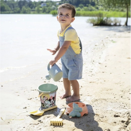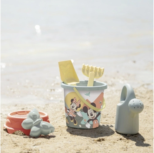 De set bevat een emmer met afbeelding van Mickey Mouse, een harkje, een schepje, een vormpje en een gieter. Bij de productie is gerecycled plastic gebruikt. Gemaakt in Frankrijk.