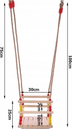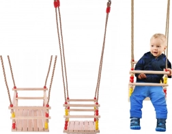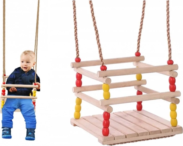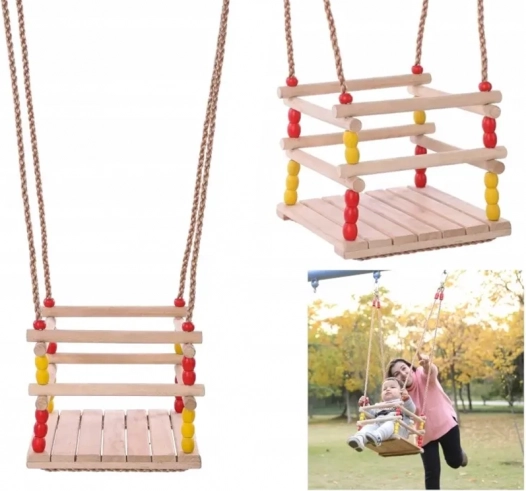 Deze houten schommel met een zitvlak van 30 × 30 cm en een veiligheidsbeugel aan de voorkant is ontworpen voor kleine kinderen. Dankzij het glad geschuurde hout zit hij comfortabel en voelt hij prettig aan. Na geschikte impregnatie is hij geschikt voor binnen en buiten – hang hem aan een boom, pergola of vrijstaande constructie.