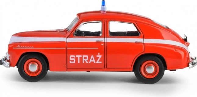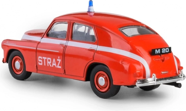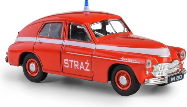 De iconische PRL Warszawa M-20 is een symbool van het naoorlogse automobieltijdperk. De eerste wagen rolde op 6 november 1951 om 14:00 uur van de band en verwierf al snel populariteit buiten Polen – de export begon al in 1954. Dit model in brandweeruitvoering vangt trouw de lijnen en verhoudingen van die tijd, waardoor het perfect past in de collectie van liefhebbers van oldtimers en historische hulpdienstvoertuigen.
