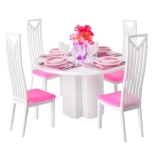 Deze doordachte meubelset verandert elk poppenhuis in een gezellige eetkamer. Dankzij realistische details – van roze placemats tot borden en bestek en zelfs glazen – beleven kinderen urenlang fantasierijk spel en poppendiners.
