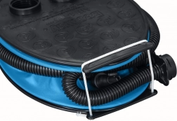 Lichte en compacte voetpomp die dankzij het lage gewicht en de slangclip gemakkelijk op te bergen en te dragen is – ideaal voor kamperen en reizen.