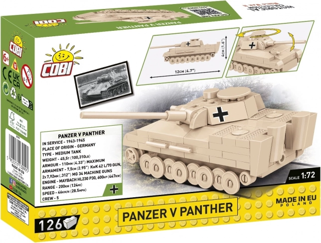 Miniatuurmodel van de legendarische tank Panzer V Panther van COBI op schaal 1:72 met 126 onderdelen voor zowel beginners als verzamelaars. Voorzien van een draaibare koepel, beweegbare loop en hoogwaardige prints met historische markeringen. Gemaakt in de EU, volledig compatibel met andere merken, met een duidelijke, beeldrijke handleiding.