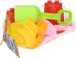 - 3 vormpjes (kasteel, vis, octopus), schepje, harkje