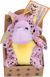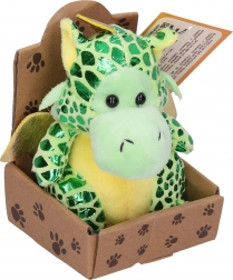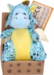 Deze pluchen draak brengt plezier met zijn glinsterende afwerking en compacte formaat van 13 cm, waardoor hij makkelijk in een rugzak past of op een plankje kan staan. De zachte stof voelt prettig aan en nodigt uit om te knuffelen, terwijl de heldere kleuren hem zowel tot een aantrekkelijke decoratie als een reisgenoot maken.