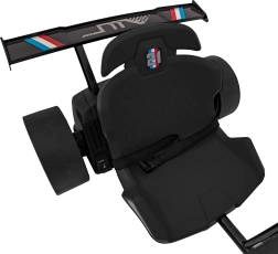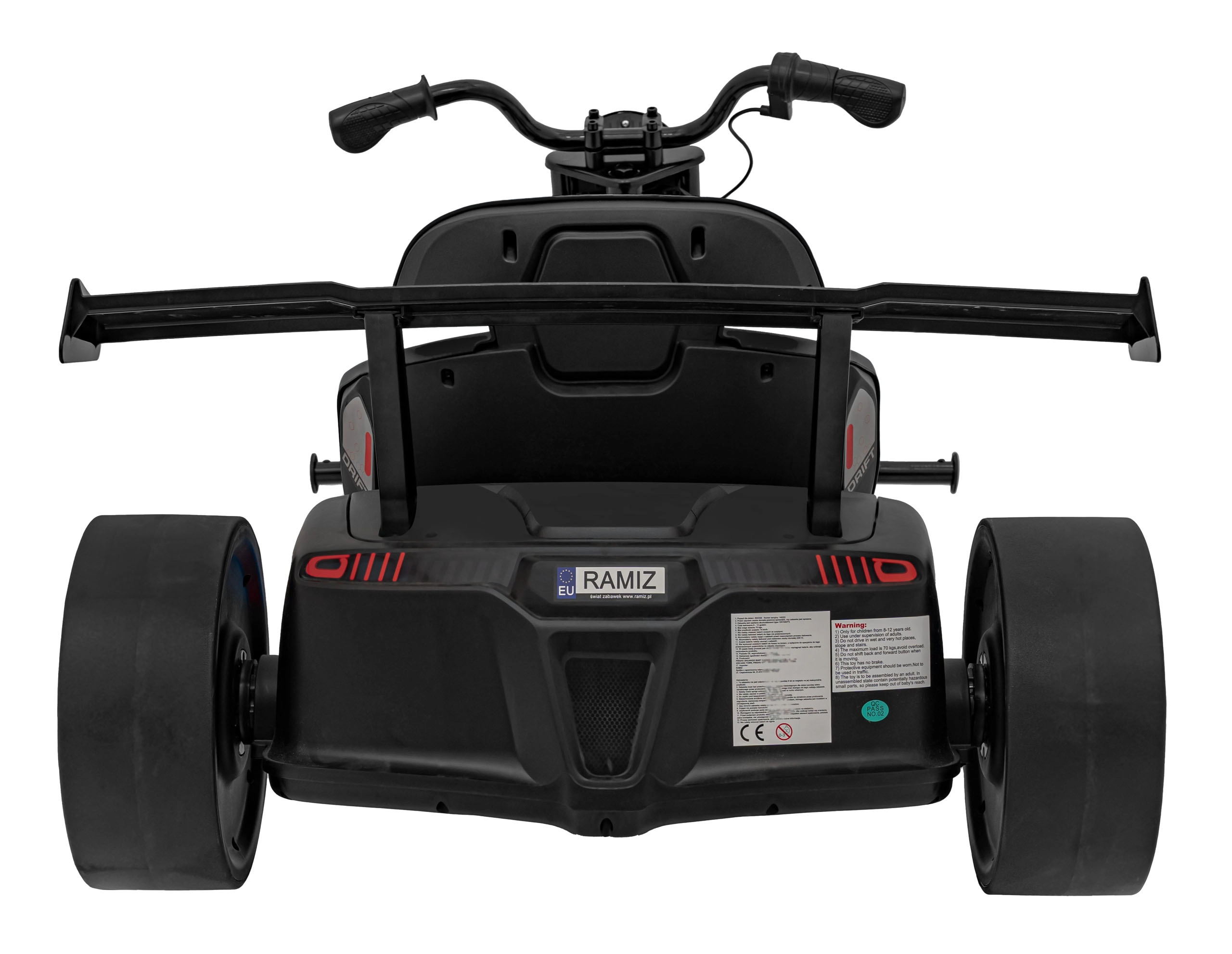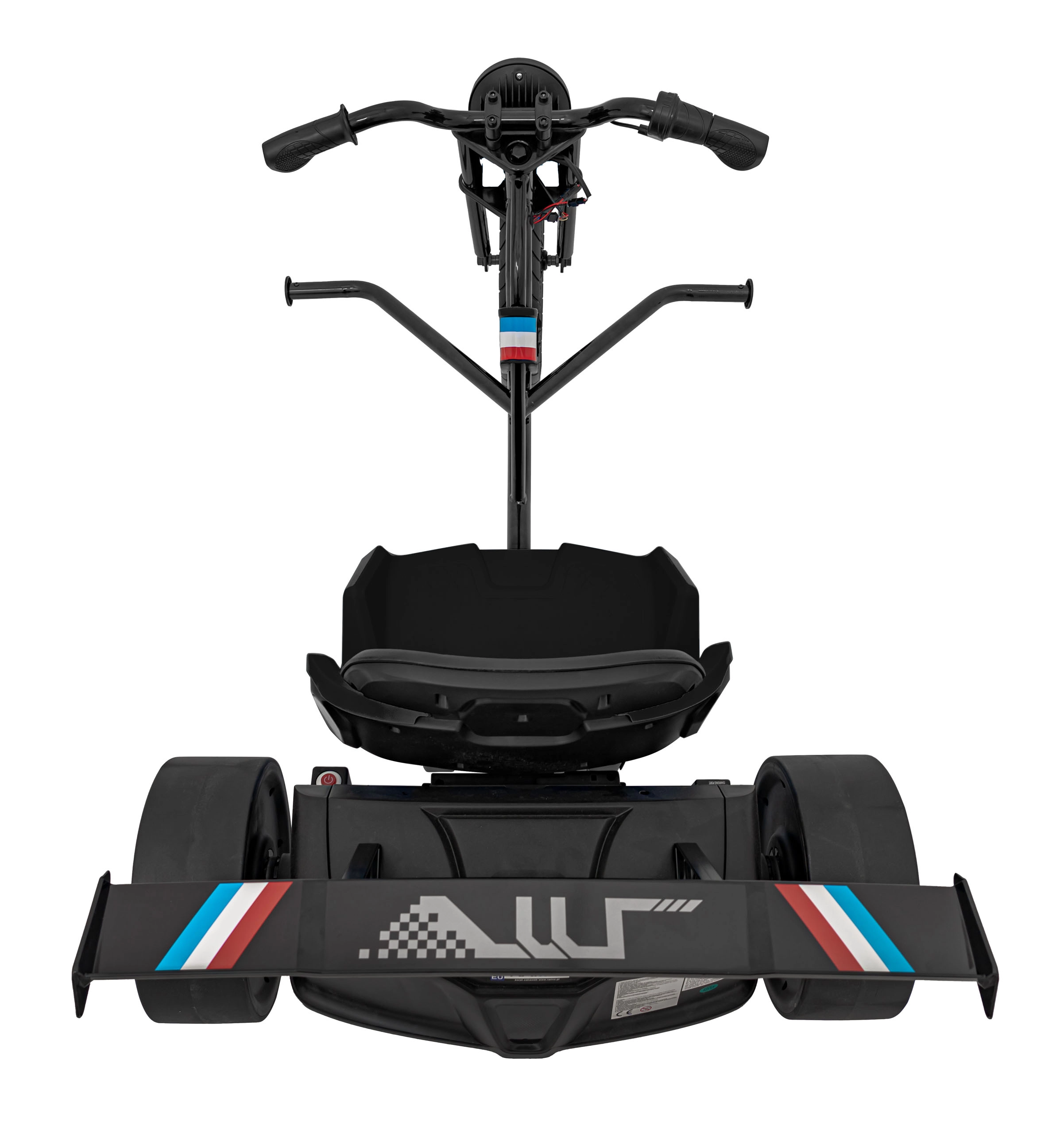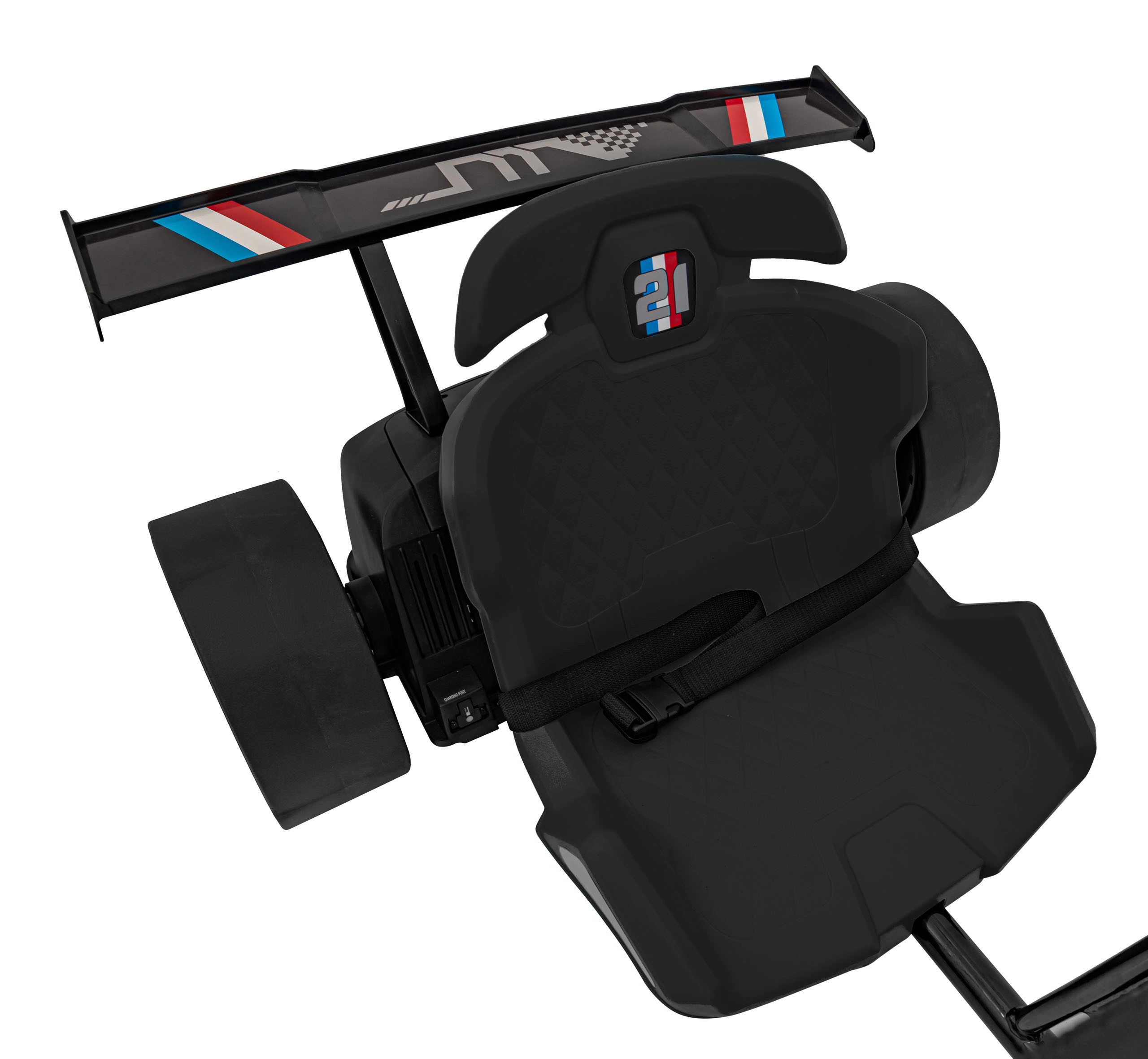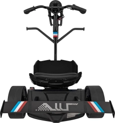 Kunststof drift-achterwielen maken gecontroleerde slippen mogelijk, terwijl de lage sportstoel met verstelling zorgt voor een stabiele zit en comfort tijdens het rijden.