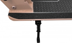Veiligheid in eigen hand: de combinatie van een handbediende schijfrem en een achterste voetrem biedt zeker en snel stoppen. Rubberen wielen 190 × 35 mm dempen kleine oneffenheden uitstekend en het antislipopervlak van het deck houdt je voet ook bij nat weer stevig vast. Een standaard voor gemakkelijk neerzetten ontbreekt niet.