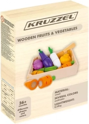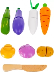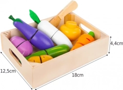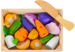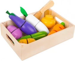 - Rijke uitrusting: wortel, aardappel, champignon, ui, komkommer, aubergine, koolrabi, houten mesje en kistje.