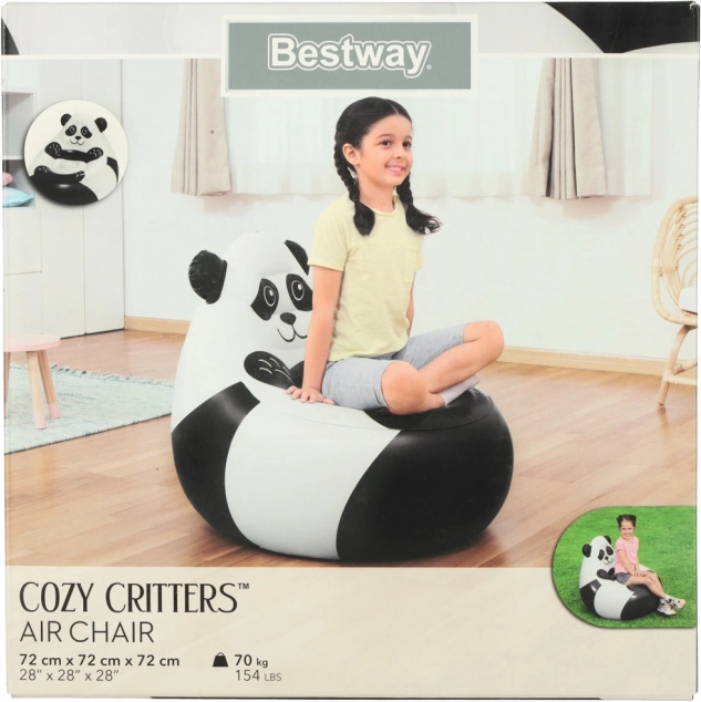Schattige opblaasbare fauteuil met pandamotief van het merk BESTWAY biedt kinderen een comfortabele zitplek en een speelse decoratie voor de kinderkamer. Dankzij het duurzame PVC-materiaal, de compacte afmetingen en een draagvermogen tot 70 kg is hij ideaal voor dagelijks relaxen thuis en in de tuin. Lichtgewicht constructie, makkelijk op te blazen en comfortabele zit zullen zowel kinderen als ouders bevallen.