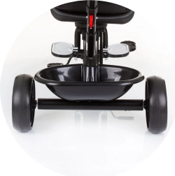 Veiligheid staat voorop: de driewieler heeft een afneembare veiligheidsbeugel, veiligheidsriemen en een stabiel frame. Ouders zullen de verstelbare duwstang, inklapbare voetsteunen en praktische mandjes voor en achter waarderen. Zodra het kind er klaar voor is, kunnen de beugel en de duwstang met kap worden verwijderd en kan de kleine rijder zelfstandig trappen.