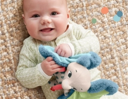 Pluizige, grote oren en satijnen details nodigen uit om te knijpen, te aaien en verschillende oppervlakken te ontdekken – ideaal voor tastontwikkeling en om tot rust te komen bij het inslapen.