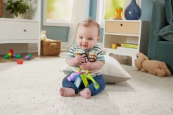 Spiegeltje voor zelfbewustzijn, knijpflacon voor tastzin en een getextureerde bijtring voor comfort bij doorkomende tandjes.