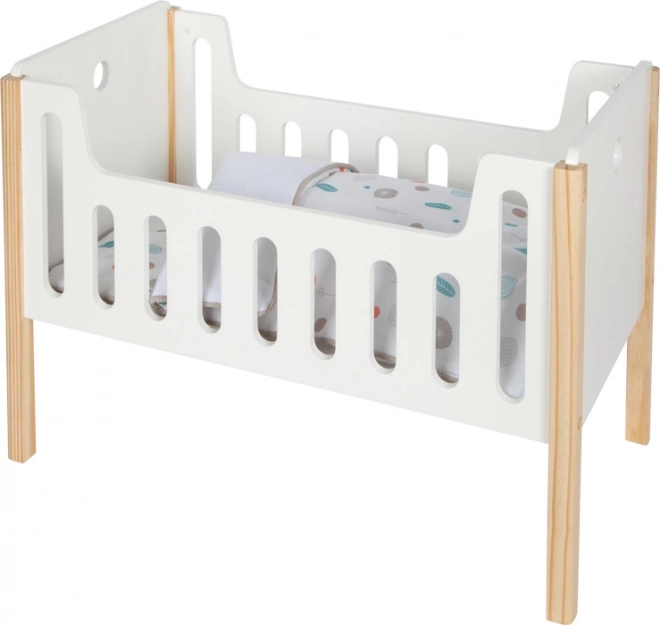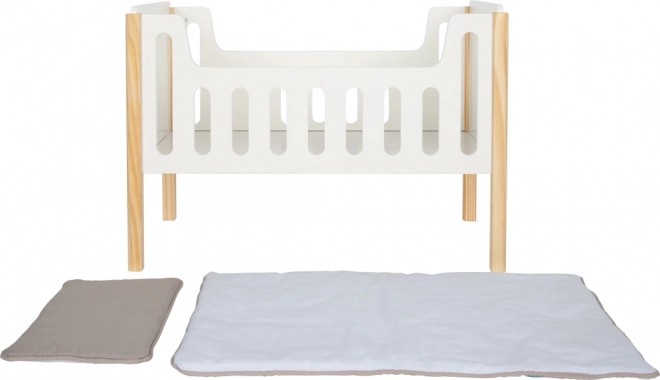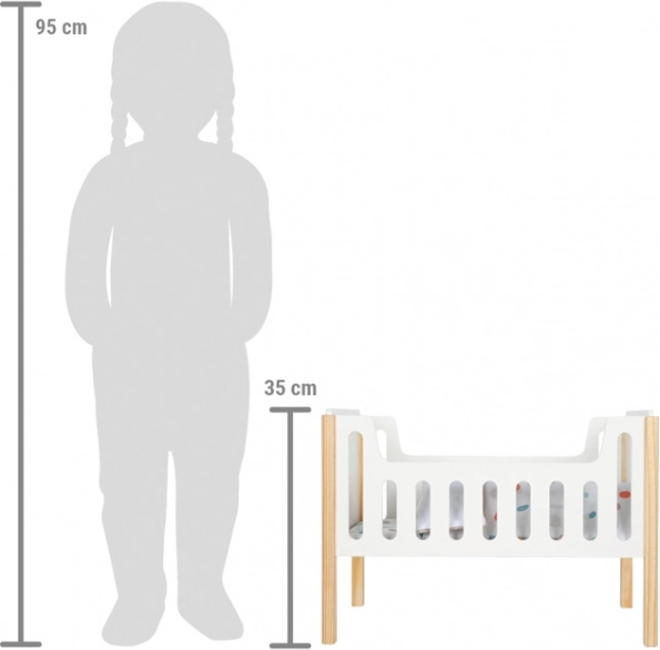 Dit moderne poppenbedje, ontworpen in een Scandinavisch lineair design, is de perfecte keuze om poppen of knuffels in slaap te wiegen. De hoogwaardige afwerking omvat afgeronde randen en massieve houten elementen voor extra duurzaamheid en veiligheid. Inclusief dubbelzijdig beddengoed met een grote deken, die een comfortabele slaap garandeert, ook voor grotere poppen. Het verhoogde ligvlak voor poppen biedt een ergonomische speelervaring.