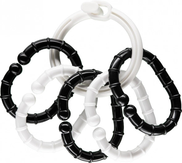 Contrasterende zwart-witte ringen met hangers ondersteunen de ontwikkeling van het zicht en de fijne motoriek vanaf de geboorte. Ze zijn gemaakt van hoogwaardige kunststof en siliconen, geschikt vanaf 0+ en getest volgens EN 71 (delen 1–3 en 9) voor dagelijks veilig gebruik.