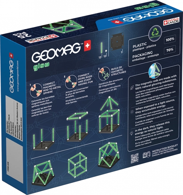 Een in het donker lichtgevende magnetische bouwset brengt je een nieuwe dimensie van plezier. De bouwset van 100% gerecycled plastic raakt in het donker zeker niet kwijt! De verpakking bevat in totaal 25 stukjes – 12 lichtgevende staafjes, 12 balletjes en één stabiele zwarte voet in de vorm van een vierkant. Geschikt voor kinderen vanaf 3 jaar.