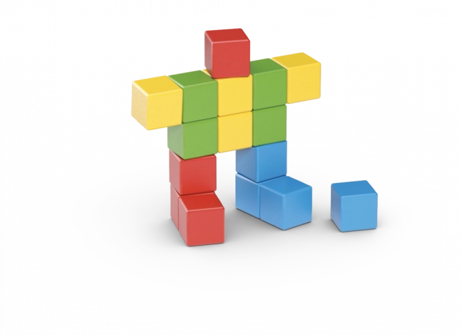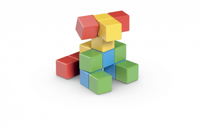 Met 16 blokken bouw je eenvoudige figuren, dieren en fantasievormen. Spel stimuleert op een natuurlijke manier verbeeldingskracht en logisch denken.