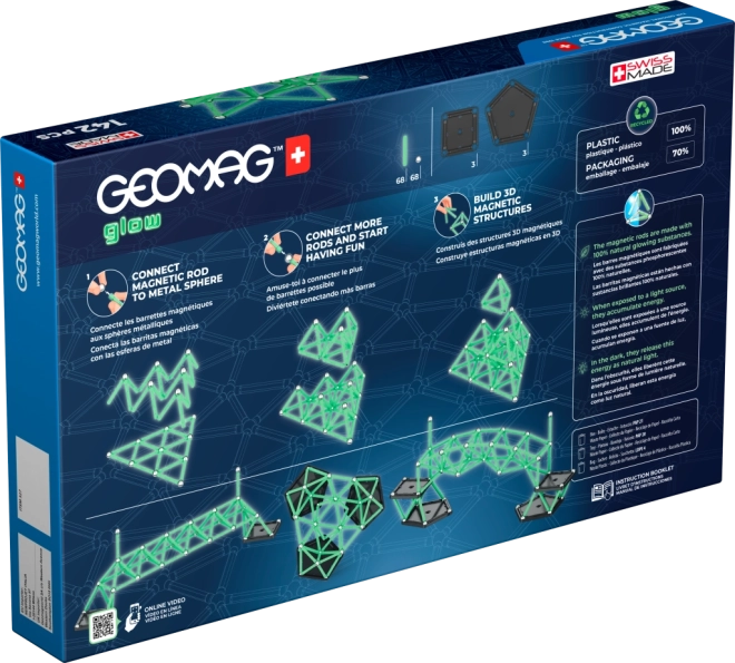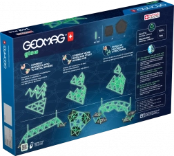 Ontdek de creatieve wereld van magnetische constructies met de Geomag Glow bouwset, die in het donker oplicht en de verbeelding van zowel kinderen als volwassenen prikkelt. Dankzij de combinatie van lichtgevende staafjes en stalen balletjes maak je eenvoudige en complexe 2D- en 3D-modellen die stabiel zijn dankzij de stevige bases.