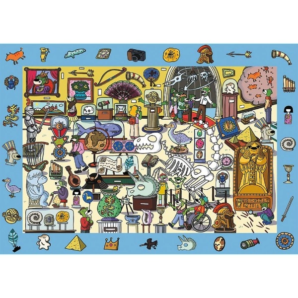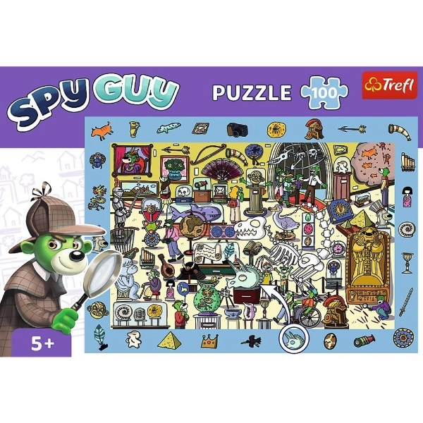 Ontdek de leuke observatiepuzzel SPY GUY met het thema Museum en 100 stukjes, die aandacht, geheugen en verbeeldingskracht traint. Leg een kleurrijke scène vol details en zoek naar verborgen elementen langs de rand van het plaatje – kun je ze allemaal vinden?