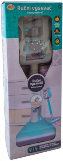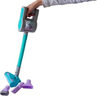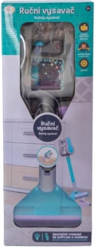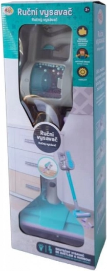 Handstofzuiger met verwisselbare opzetstukken. De stofzuiger werkt op batterijen en maakt een zuigend geluid. Elke huisvrouw zal van deze stofzuiger houden. Hij is altijd binnen handbereik.