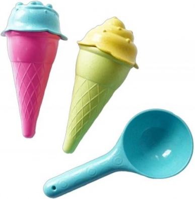 Zandspeelset voor kleine ijsverkopers: hoorntje, bolletje en een serveerlepel om perfecte “ijsjes” van zand te maken. Makkelijk scheppen, buitenspeelplezier en stimulatie van creativiteit op het strand en de speeltuin.