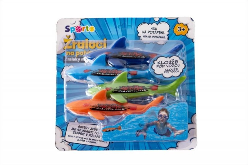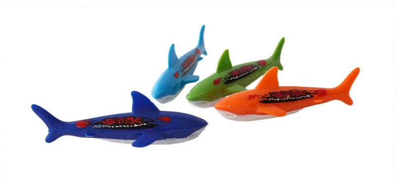 4 kleurrijke haaien die zinken zodra je ze in het water gooit, en die jij weer moet opduiken.