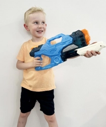 De duurzame kunststof constructie, ergonomisch handvat en soepel reagerende trekker zorgen voor comfortabel en veilig gebruik. Het futuristische design in blauw-zwart spreekt zowel jonge als volwassen strijders aan en stimuleert actieve beweging in de buitenlucht.
