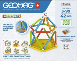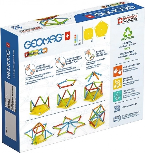 Ontdek de creatieve wereld met de magnetische bouwset GEOMAG Supercolor Panels Recycled met 42 delen. Krachtige magneten, kleurrijke panelen en metalen bolletjes maken het mogelijk om uiteenlopende 2D- en 3D-constructies te bouwen en zo fijne motoriek, ruimtelijk inzicht en creativiteit te ontwikkelen. Gemaakt van 100% gerecycled plastic – plezier dat vriendelijk is voor de planeet.