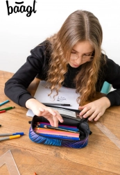 Een stevige etui met uitklapbare scheidingswand biedt maximale bescherming en efficiënte indeling van schoolspullen.