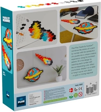 De set Plus-Plus Puzzel op nummer – Ruimte biedt een slimme manier om creatief bouwen te koppelen aan leren. Kinderen koppelen kleuren aan cijfers volgens de meegeleverde sjabloon en leggen stap voor stap een indrukwekkende ruimtemozaïek van een planeet en een komeet. Het eindresultaat is perfect als kamerdecoratie.