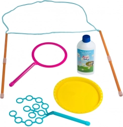 Hoe pak je het aan? Giet de oplossing in een ondiepe schaal, doop het gekozen opzetstuk erin en maak met een vloeiende beweging van links naar rechts prachtige bellen. Eenvoudig, snel en leuk!