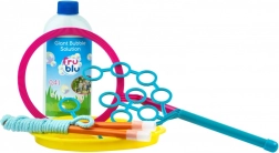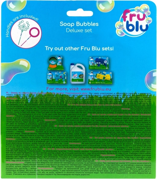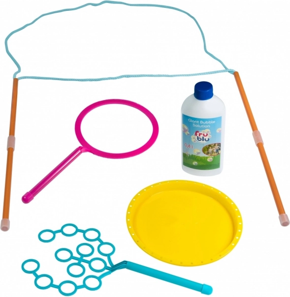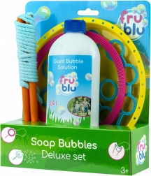 De deluxe FRU BLU bubbelset met 0,4 l oplossing biedt een compact, gemakkelijk op te bergen systeem voor het maken van zowel kleine als reusachtige bellen. Dankzij de eenvoudige montage, 3 verwisselbare opzetstukken en de meegeleverde 0,4 l oplossing genieten kinderen én volwassenen van maximale buitenspeelpret, op feestjes én elke dag.