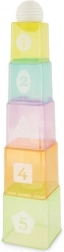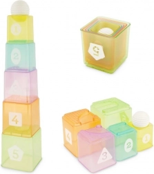 Speelse set voor de allerkleinsten: vijf transparante bekers in verschillende kleuren met nummers en een licht balletje. Kinderen kunnen de bekers tot een toren stapelen of een tunnel maken en het balletje erdoor laten rollen. Stimuleert fijne motoriek, het leren van kleuren en cijfers en coördinatievaardigheden.