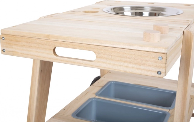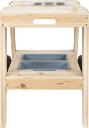 Twee uitneembare kommen en een roestvrijstalen spoelbak nodigen uit tot mixen, scheppen en “koken”. Een ideaal alternatief voor de zandbak om zintuigen en fantasie te prikkelen.