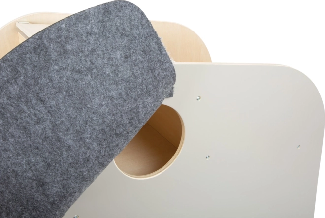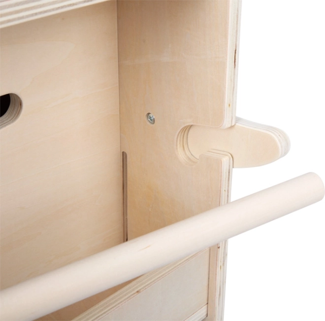 Tussen de ‘slagtanden’ zit een uitschuifbare houten staaf om een papierrol aan op te hangen – kinderen kunnen altijd direct tekenen en alles blijft netjes.