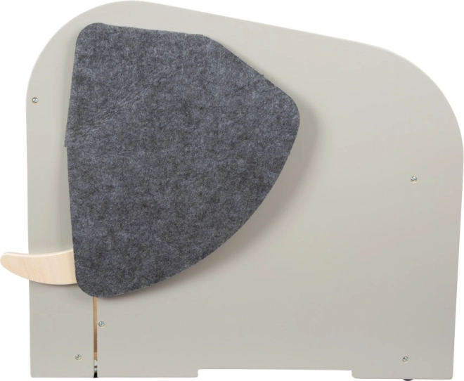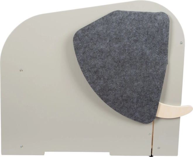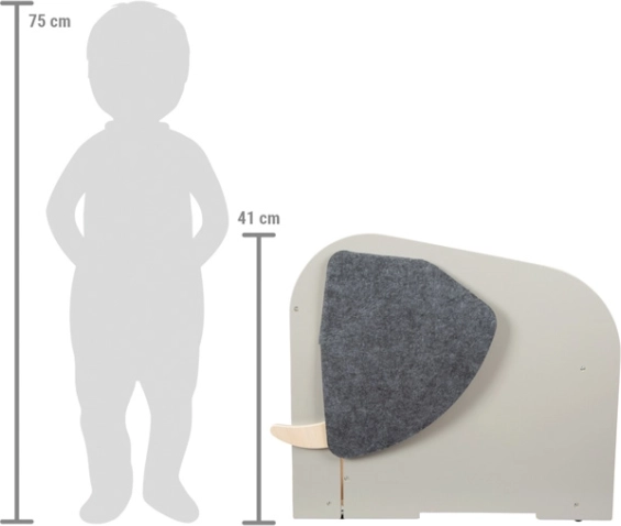 De box biedt royale ruimte voor ook grotere speelgoedstukken, voorvakken voor boeken en schrijfwaren en verbergt tussen de ‘slagtanden’ een uitschuifbare staaf om een papierrol voor tekeningen op te hangen. Hoogwaardige vilten oren bedekken geheime openingen, de draaibare ‘olifantenstaart’ dient als handig handvat om te openen en sluiten en kan kleine spulletjes verbergen.