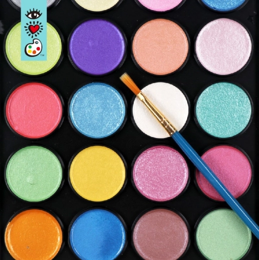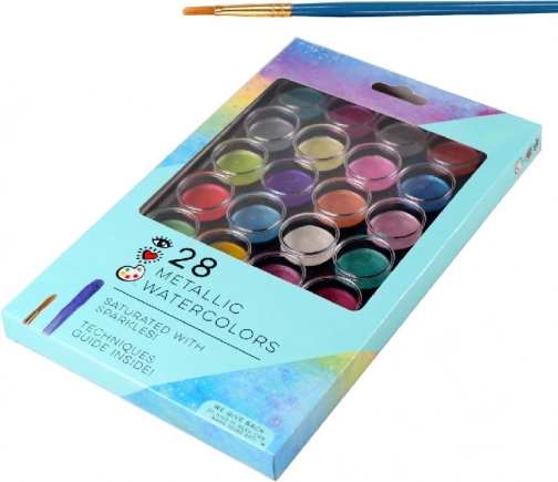 Ontdek de eindeloze mogelijkheden van kleuren en creëer je eigen, unieke schilderijen. Deze praktische, compacte set van 28 aquarelkleuren in prachtige metallic tinten stelt iedereen in staat zijn of haar creativiteit te uiten. De set zit in een kunststof etui dat de verf beschermt tegen uitdrogen en het dagelijks gebruik vergemakkelijkt. De set bevat een penseel en een beknopte gids met aquareltechnieken. Daarmee leert iedereen kleuren te combineren en nieuwe tinten te creëren. Het is een ideaal cadeau voor kinderen, vrienden, voor iedereen die graag schildert.
