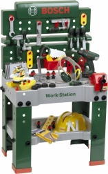 De volledig uitgeruste kinderwerkbank wordt in Duitsland geproduceerd onder licentie van Bosch. Het werkblad biedt diverse realistische functies, een bankschroef, praktische opbergruimtes en een legvak. Op de achterwand van de klusjeswerkbank en op de plank onder het werkblad is ruimte voor de hoogwaardige 81-delige accessoires, waarvan sommige met behulp van praktische haakjes aan de wand kunnen worden opgehangen: een kindersnoerloze elektrische schroevendraaier, platte en kruiskopschroevendraaier, steeksleutel, ratel, tang en vijl, hamer, zaag en meetlint, winkelhaak, liniaal en een schroefklem. Kinderen leren handig omgaan met schroeven, moeren en schroefelementen in verschillende maten en vormen, en letten op veiligheid dankzij de speelgoedhelmen en veiligheidsbrillen, gehoorbeschermers en handschoenen. Extra leuk is het zelf te monteren voertuig, dat op de werkplek kan worden gedraaid en opnieuw opgebouwd. Zo verandert de kinderkamer in een werkplaats! Zet de helm en veiligheidsbril op, trek de handschoenen aan en je kunt beginnen met zagen, hameren en schroeven. IJverige ontwerpers worden geholpen door de bankschroef, die latjes vasthoudt die met spijkers of schroeven bevestigd moeten worden. Er is ook een accuschroevendraaier die, met licht en geluid, alles vastdraait wat de kleintjes willen samenstellen tot iets groots. En als het werk klaar is, kan alles snel worden opgeruimd aan de haken en in de bakjes.