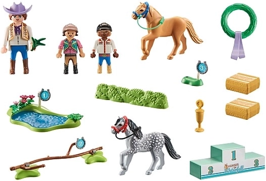 Beleef een spannende competitie op de voorbeeldige piste met verschillende hindernissen, zoals een watergreppel, takken en strobalen. Ruiters laten hun vaardigheden zien en aan het einde wacht de winnaar een beker en voor de pony een lauwerkrans. Of je nu eerste of tweede wordt, het belangrijkste is de speelervaring.