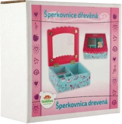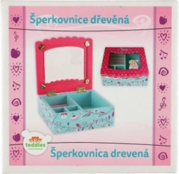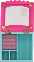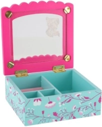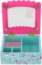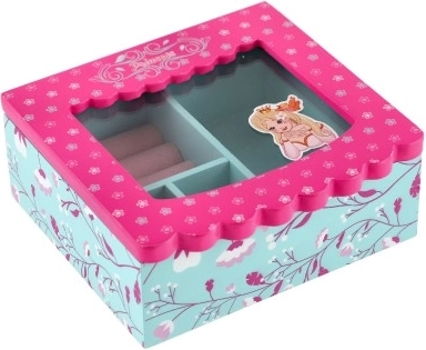 Stijlvolle houten sieradendoos voor kleine dametjes en volwassenen, die verrast met de turquoise‑roze kleurcombinatie, het bloemenmotief en een praktische spiegel onder het deksel. De overzichtelijke vakjes voor sieraden en kleinigheden helpen alles netjes te organiseren, en dankzij de compacte afmetingen past hij op elke kaptafel of in de kinderkamer.