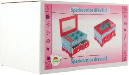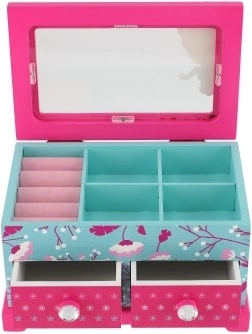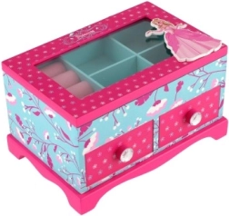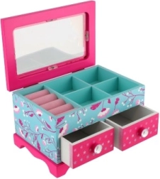 Elegante kindersieradendoos van hoogwaardig hout met een opklapbaar deksel en twee laden, ideaal voor het opbergen van sieraden en kleine schatten. Valt op door het kleurrijke design met bloemen- en vogelmotief in een roze-blauwe combinatie en versiering met een prinsessenmotief. De praktische indeling en geïntegreerd spiegeltje maken dagelijks gebruik in de kinderkamer eenvoudig.