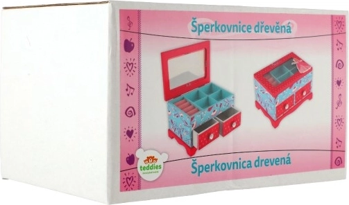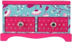 Het oppervlak van de sieradendoos is versierd met subtiele bloemen- en vogelmotieven in een combinatie van roze en turkooisblauw, die elke kinderkamer prachtig aanvullen. Dankzij de stevige houten afwerking en de gladde grepen is hij voor kinderen prettig in gebruik. Geen speelgoed – geschikt als decoratief en opbergobject.