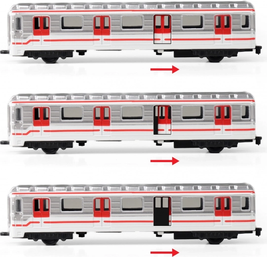 De afzonderlijke rijtuigen kunnen eenvoudig achter elkaar worden gekoppeld. Eén deur opent met een hendeltje aan de onderzijde voor nog realistischer speelplezier.