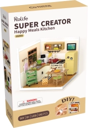 Bouw je eigen knusse keukhoekje met de miniatuursset ROBOTIME Happy Meals. Deze schattige bouwkit biedt een vintage design, realistische etensdetails, een openende oven en koelkast en LED-verlichting voor de perfecte sfeer. Ideaal als creatief project en stijlvolle interieurdecoratie.