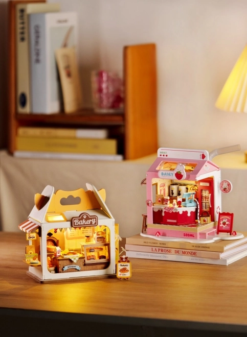 Verzorgde vitrines, bordjes en een rijke uitrusting zorgen voor een realistische uitstraling van de bakkerij, die prachtig staat op een plank of bureau.