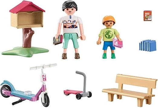 - Prachtig ontworpen set met twee PLAYMOBIL-figuren, een minibibliotheek met standaard, een stapel boeken, drie boekjes, een bankje en verdere accessoires.
