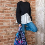 Het opvallende abstracte motief in tinten paars, blauw en roze geeft je outfit flair en zorgt ervoor dat de zak niet over het hoofd wordt gezien.