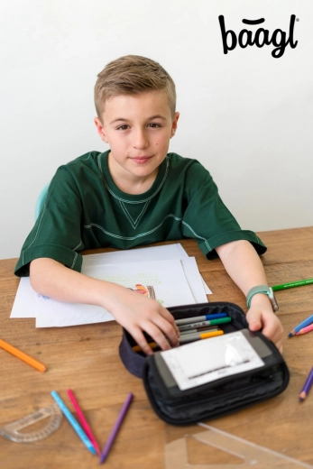 Stijlvolle schooletui BAAGL Goal met voetbalmotief biedt een stevige constructie, een praktisch uitklapbaar tussenschot, een binnenvak met rits en een vak voor het rooster. Gemaakt van gerecycled materiaal en voorzien van hoogwaardige YKK-ritsen. Zonder inhoud – klaar voor je favoriete schrijfwaren.