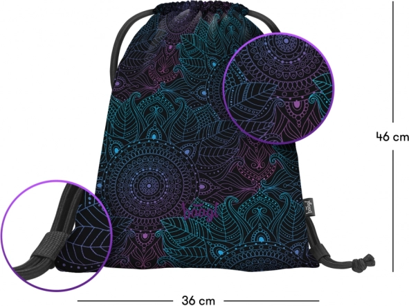 De praktische en lichte BAAGL Zen gymsack valt op door het moderne ontwerp met een mandala in paarse en turquoise tinten op een zwarte achtergrond. Geschikt voor schoenen, sportuitrusting en spulletjes die je altijd bij de hand wilt hebben. Dankzij het duurzame en afwasbare materiaal is hij perfect voor dagelijks gebruik.